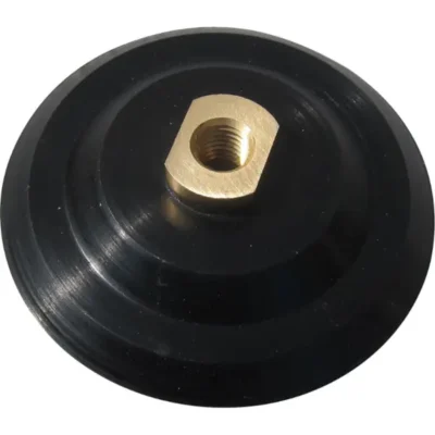 Our rigid plastic backer WILL stay flat, every time. And, plastic backers are less expensive than aluminum and won't corrode, but still provide excellent performance and flatness. Arbor size is 5/8" diameter, 11 pitch (5/8"-11).
