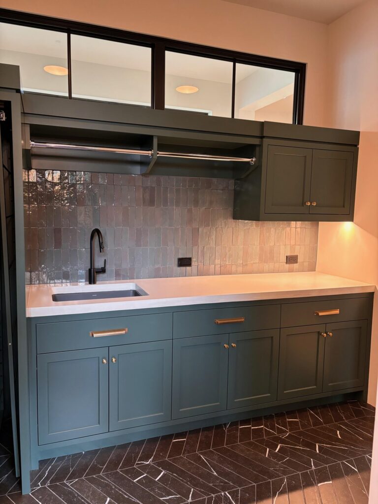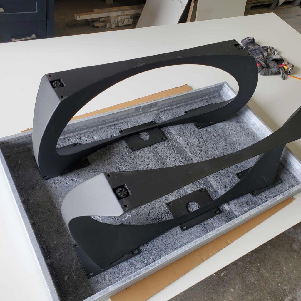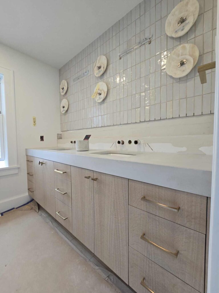 We used Integrity products to create this beautiful white with gray marble kitchen bar top. Using Integrity Alphapro Ultra Adpack allowed us to cast concrete 34″ thick, keeping the weight down to a minimum and allowing the concrete to be strong enough to be flipped and processed 24 hours after casting. Ultraflow dry superplasticizer worked fantastically. Integrity’s superplasticizer worked amazingly, as the mix started out mixing dry and after little less than a minute of mixing, mix went wet and flowed extremely well in the mold, allowing entrapped air to be released. We also used Integrity’s Ar glass fibers, they worked great, there wasn’t any trouble with mix chocking up and we had no fibers showing. Using Integrity products allows us to customize our mixes to fit each project individually, making each piece a truly one-of-a-kind!!