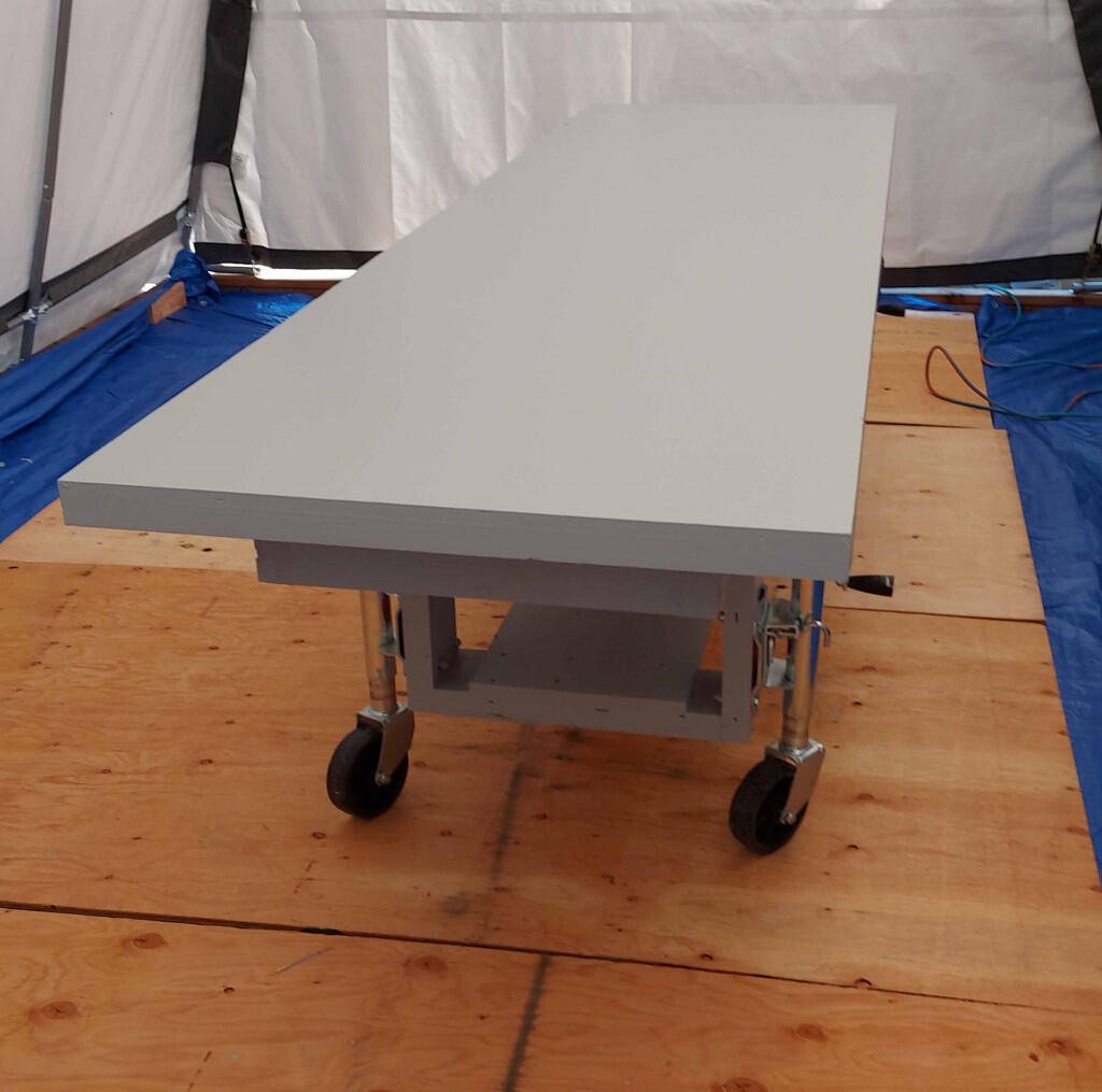The casting table uses trailer jacks as legs. These can be height adjusted. The table is low in the photo, but the hand cranks will elevate it to whatever height you want.