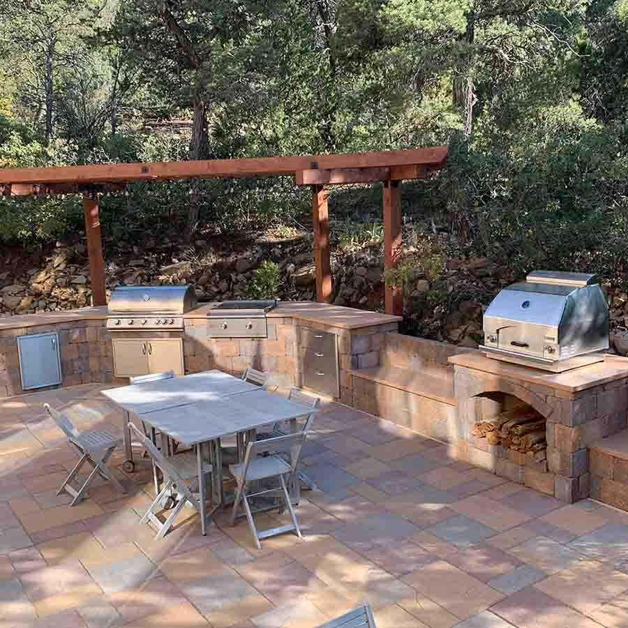 I am a DIYer and have finished my initial concrete countertop project. I don’t have plans for another project at the moment, but I want to say I really appreciated your course and I learned a lot. My project included an outdoor countertop for a grill and griddle island and a pizza oven island. I poured the concrete in my garage and moved the slabs into place as instructed in the video. The grill/griddle counter took five slabs and one for the pizza oven. We live in the mountains of New Mexico, so I included a little air entrainer in the mix to help it last through snowy winters without deterioration – so far so good. In addition to the course, I bought the color spreadsheet, which was very helpful (I did three small color samples before we found the perfect one). The selected color is basically “toast.” We chose to leave the cream finish on top with “salt and pepper” effect on the edges for a subtle contrast. Here are some photos. (The benches are wood, not concrete.) We are very pleased with the results. Most importantly, my wife loves the look of the new space and the countertops. Thank you for offering these resources.
